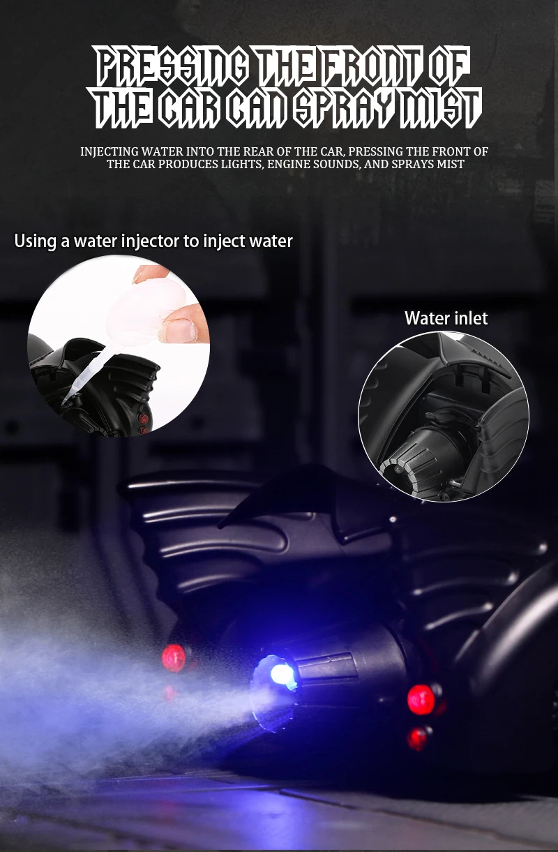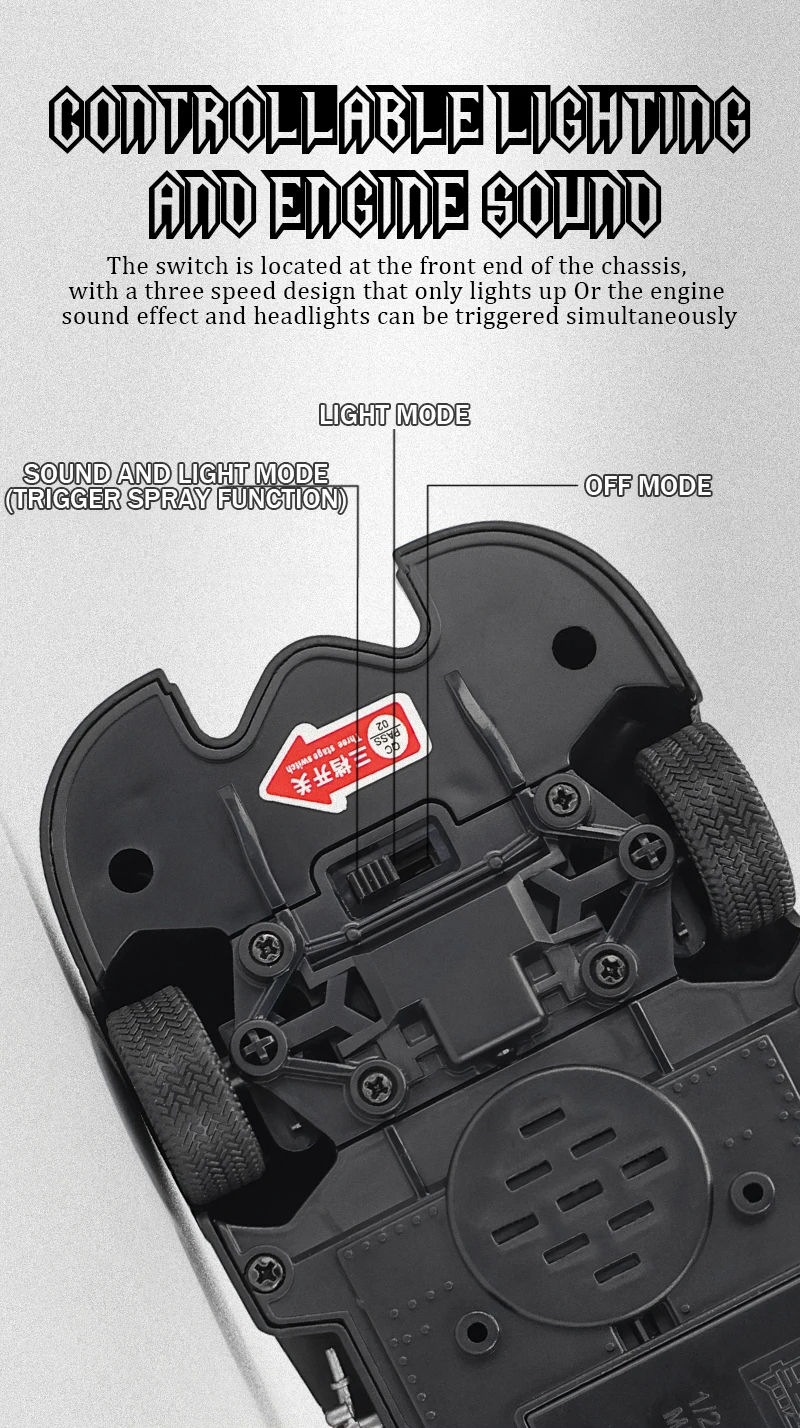 ✅ turn the switch to the sound mode, produce sound effects the front lights are on mist sprayed out.